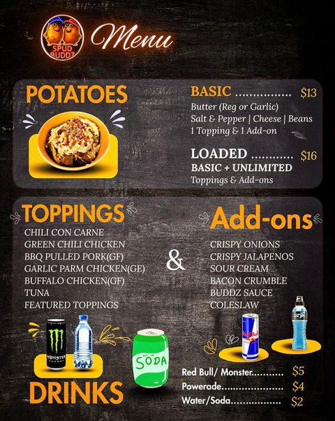 At Spud Buddz, we specialize in gourmet baked potatoes that redefine comfort food. Our food truck serves the Greater Phoenix area, bringing you gourmet flavors cooked to perfection with our exclusive European ovens, ensuring every potato is a culinary experience.